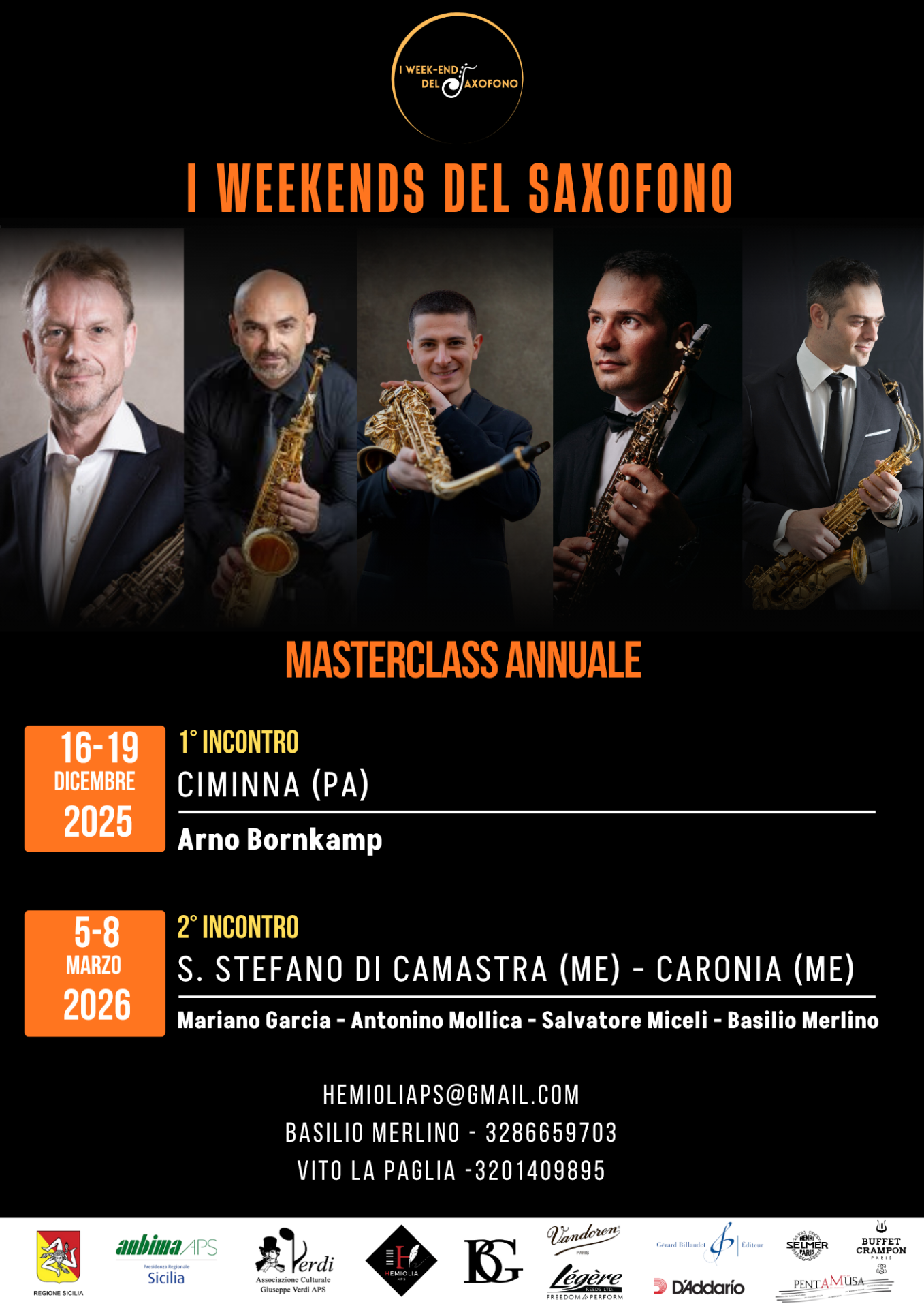 I Week-ends del Saxofono è un evento unico nel suo genere, dedicato agli amanti della musica e del saxofono. Un'esperienza imperdibile per i musicisti e per chi vuole avvicinarsi al mondo del saxofono. Novità della 6° Edizione il corso annuale di perfezionamento con docenti di fama internazionale.